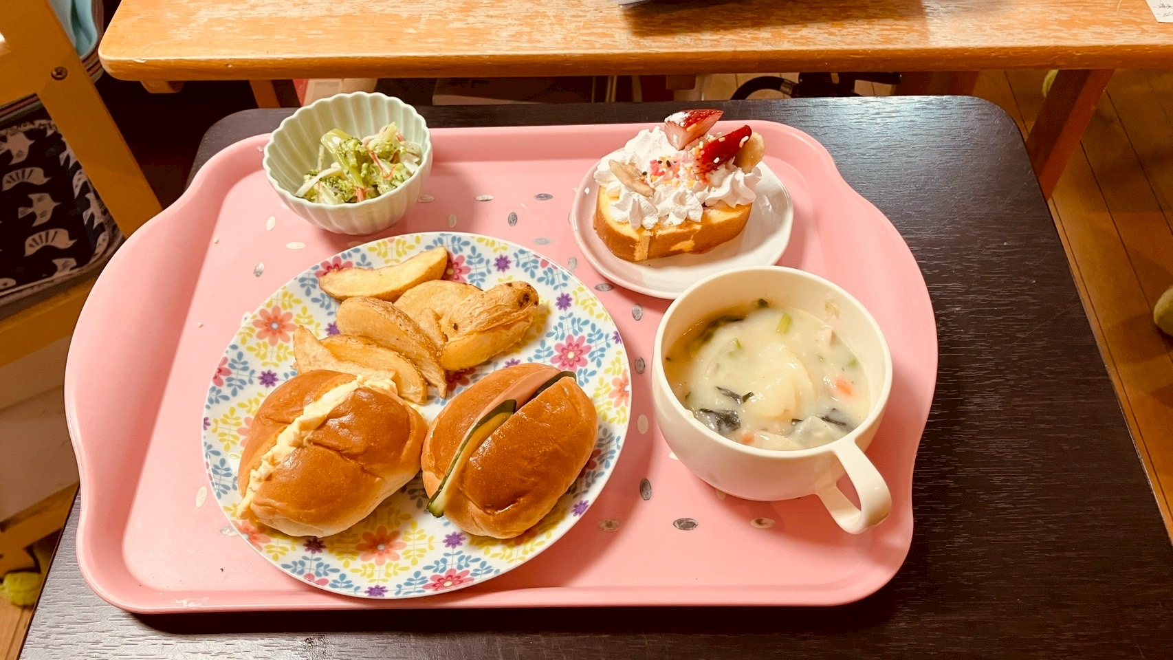 ちらし寿司、彩り天ぷら、なのはなとカニカマのサラダ、かぼちゃ煮、いちごのムース